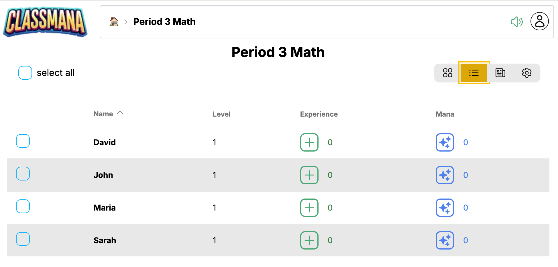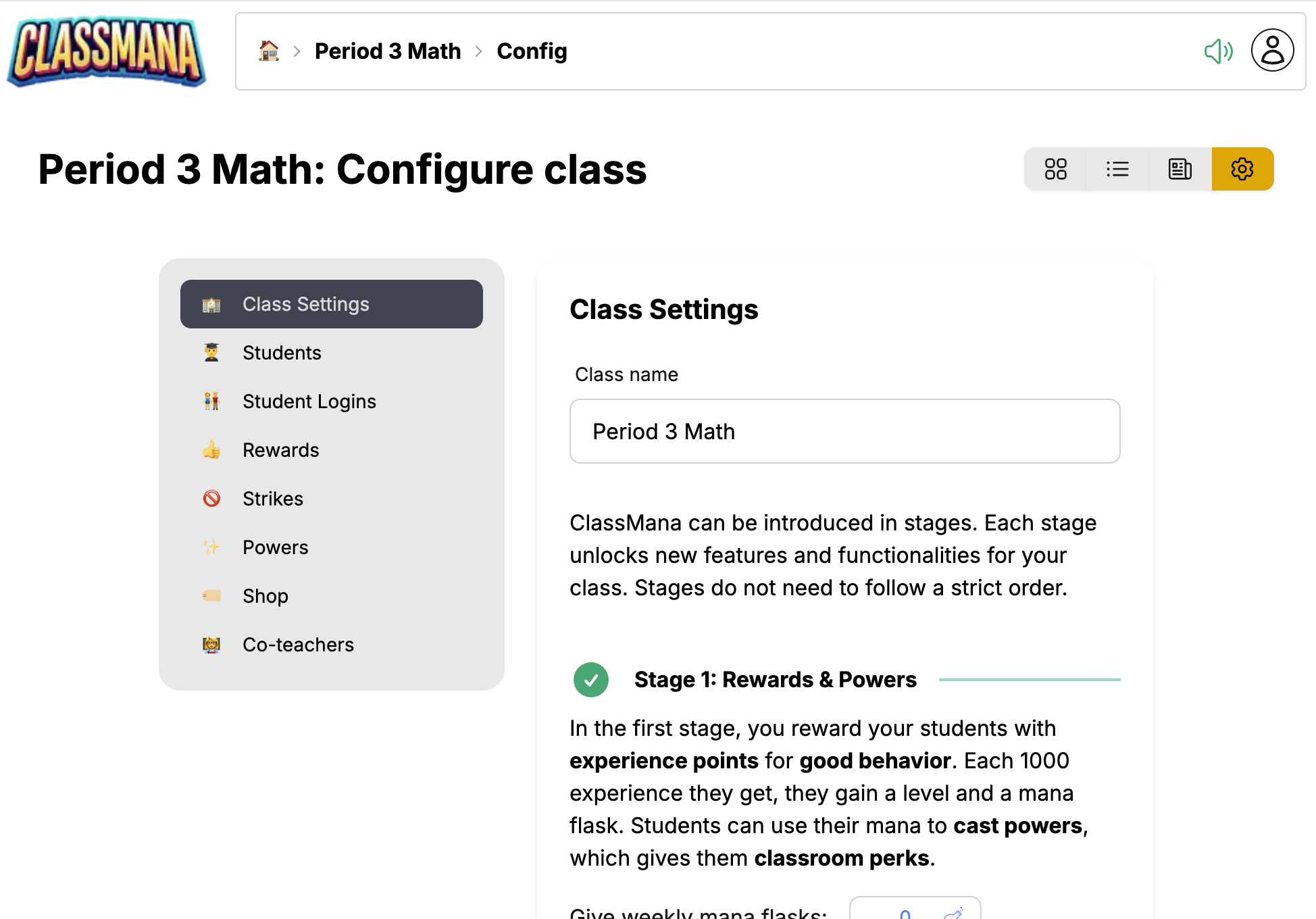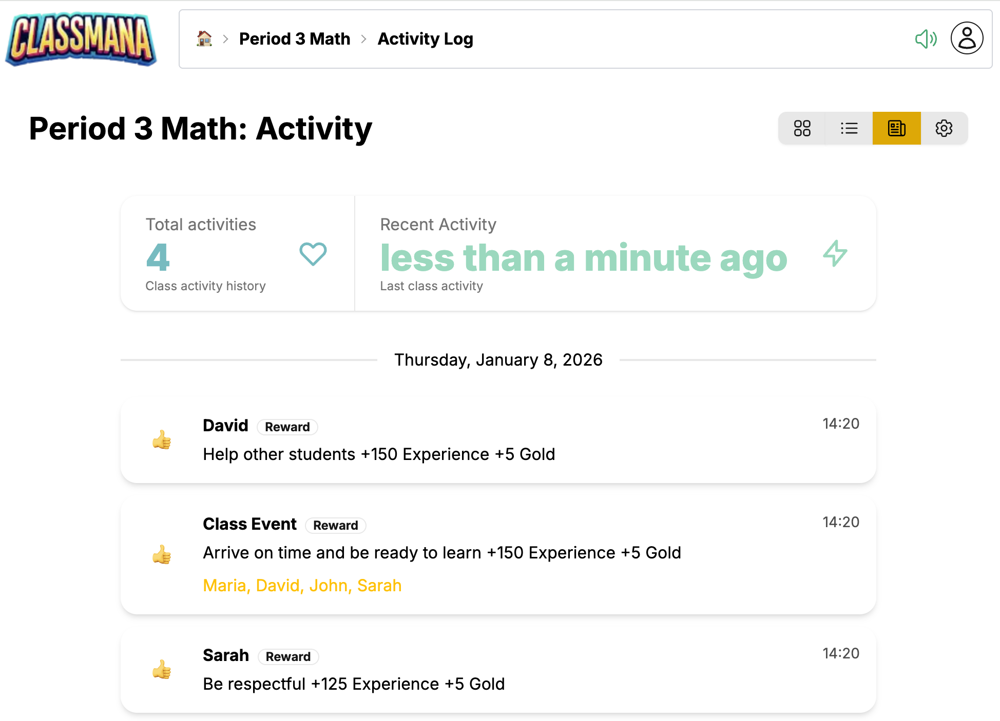 Klasės valdymo skydas yra jūsų pagrindinis centras klasės valdymui. Čia galite peržiūrėti mokinius, duoti apdovanojimus, naudoti galias, sekti veiklą ir konfigūruoti klasės nustatymus.